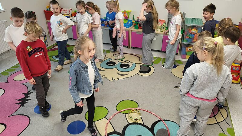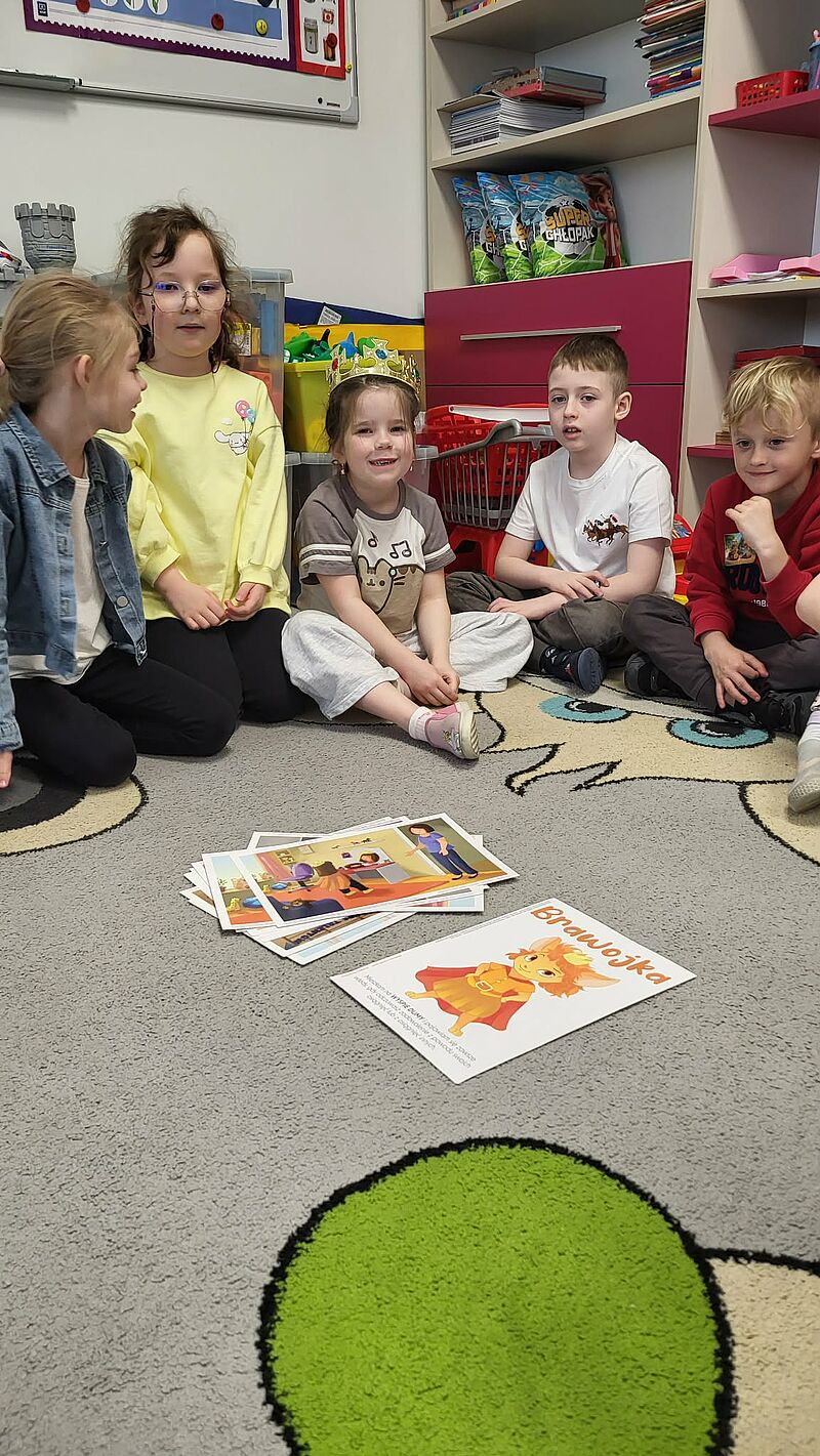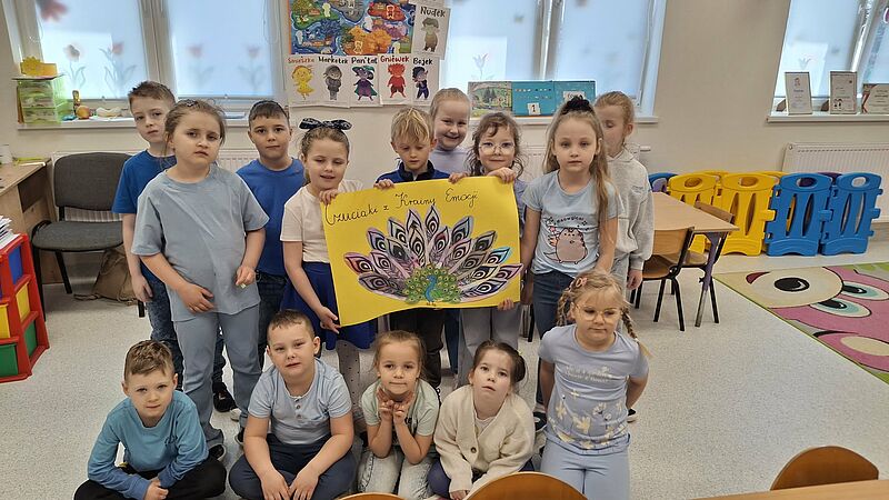 Podczas zajęć dzieci wysłuchały opowiadania o Brawojce, która uczy jak cieszyć się z własnych sukcesów i mówić o nich głośno. Dzieci rozmawiały z nauczycielem o tym czym jest duma oraz dlaczego warto dostrzegać swoje osiągnięcia – nawet te najmniejsze. Zostały wyjaśnione pojęcia „dumny jak paw” oraz „skromna jak mała myszka”, następnie pokolorowali pawie pióra i wykonali pracę grupową pt. „Paw”. Każde z dzieci dołożyło do niej swój element w postaci piórka, tworząc wspólnie piękną i barwną kompozycję. Na zakończenie dzieci pokolorowały kolorowanki z Czuciakiem i wkleiły do zeszytu.