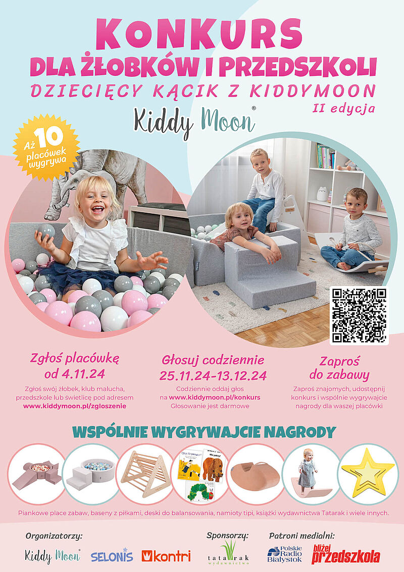 Nasze przedszkole przystąpiło do konkursu „DZIECIĘCY KĄCIK Z KIDDYMOON”. Celem konkursu jest stworzenie kreatywnych i bezpiecznych miejsc zabaw dla najmłodszych w placówkach wychowania przedszkolnego.