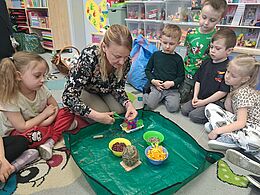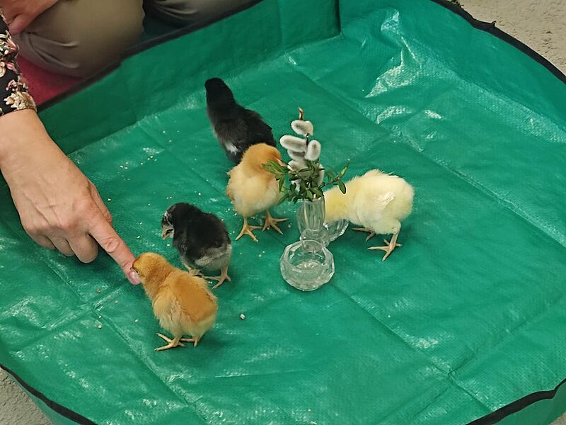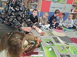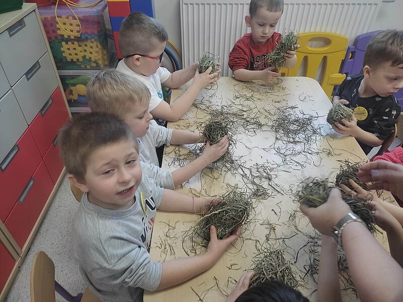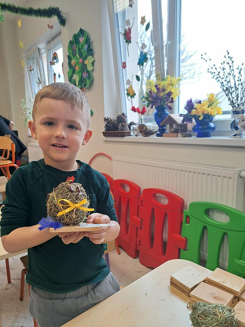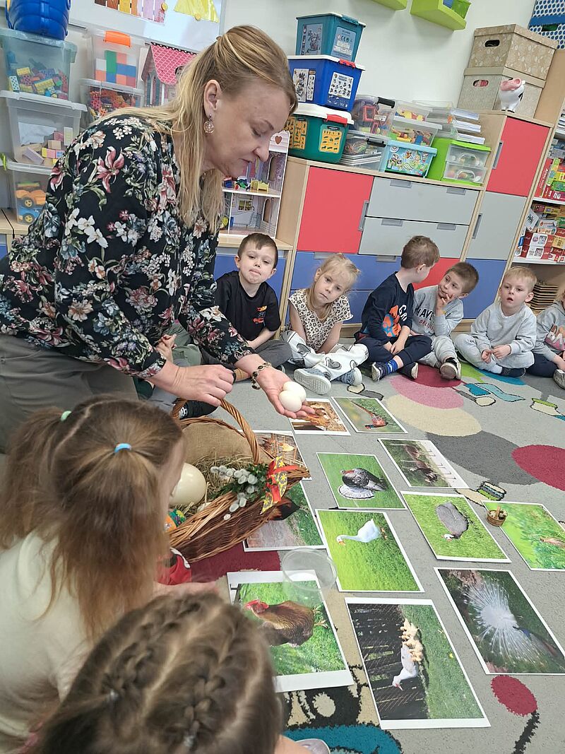 16go marca dzieci z grupy Muchomorki i Pszczółki wzięły udział w warsztatach edukacyjnych-wielkanocnych poświęconych tematyce jaj i ich pochodzenia. Podczas zajęć przedszkolaki poznały różne rodzaje jaj oraz miały okazję obejrzeć zdjęcia przedstawiające ich budowę i zastosowanie. Dzieci z zainteresowaniem wysłuchały opowiadania pani Ani o małym kurczaczku. Zdobyta wiedza została utrwalona w części plastycznej, podczas której uczestnicy wykonali stroiki w formie kurczaczków z siana. Niewątpliwie największą atrakcją dla dzieci było spotkanie z żywymi pięciodniowymi kurczaczkami, które wzbudziły wiele radości i ciekawości. Warsztaty dostarczyły przedszkolakom wielu pozytywnych wrażeń oraz cennych doświadczeń edukacyjnych.