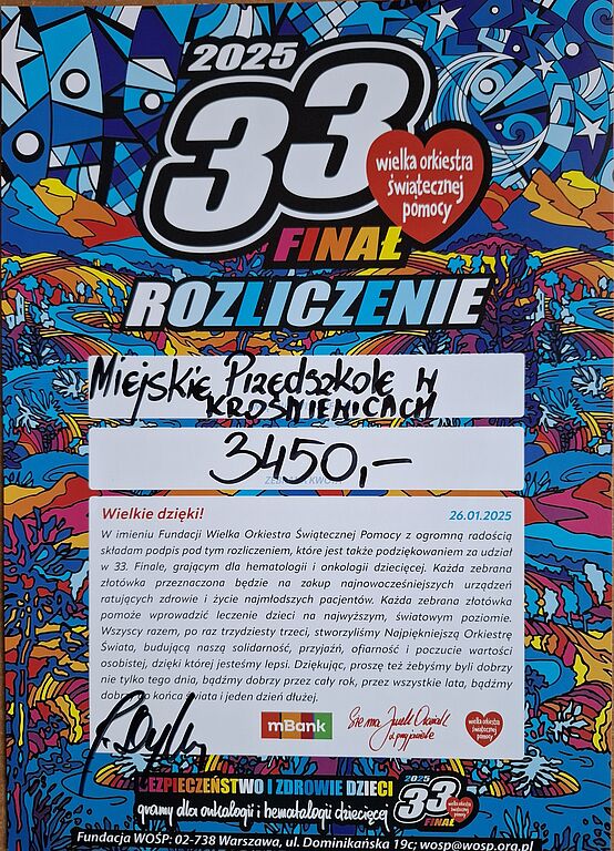 Serdecznie dziękujemy wszystkim, którzy przyczynili się do zebrania kwoty 3450 zł dla Wielkiej Orkiestry Świątecznej Pomocy.